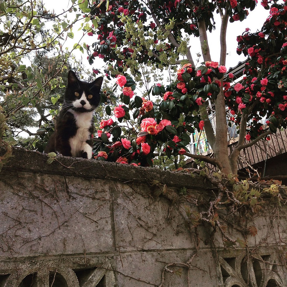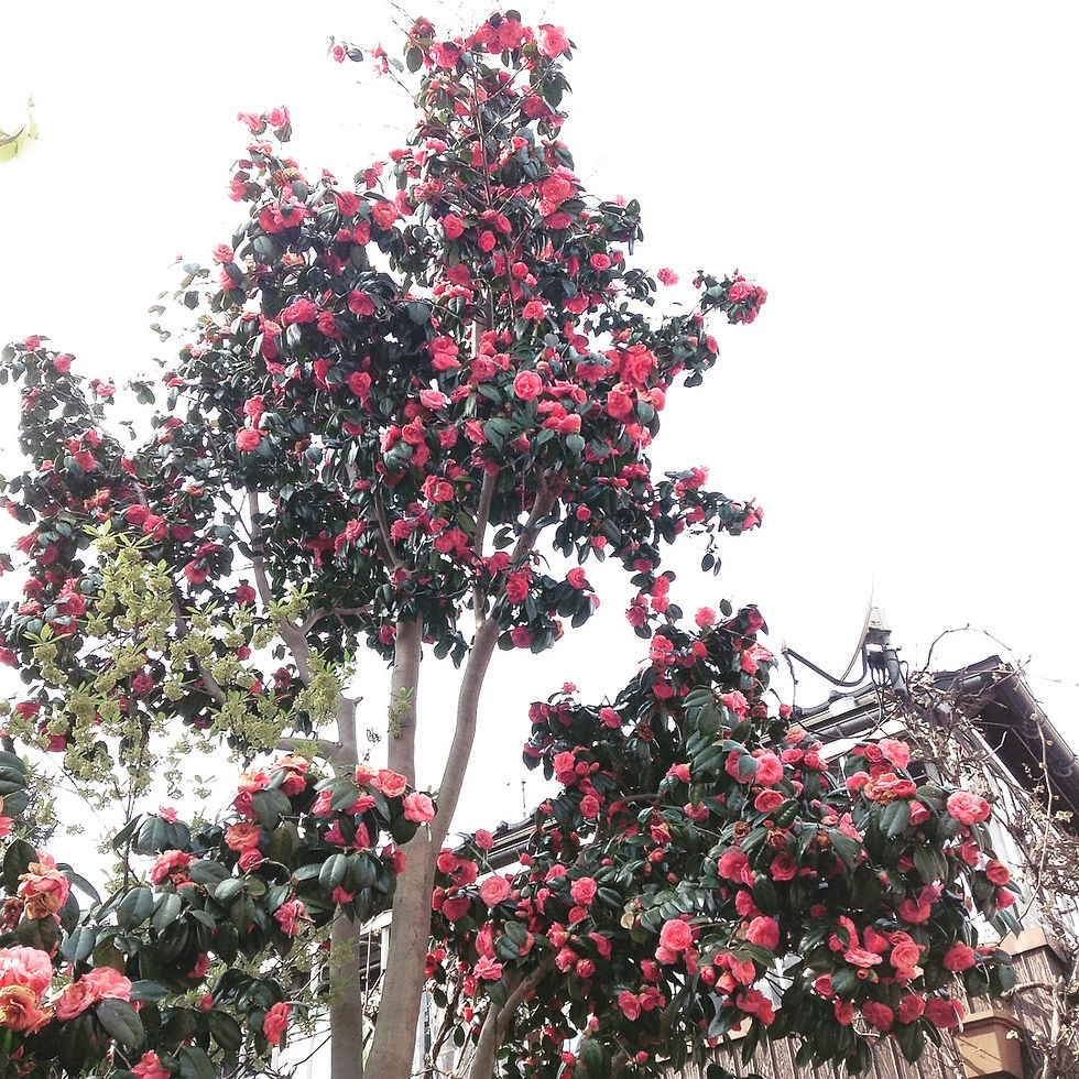 写真は娘の保育園通園で通る道の庭木。春山茶花の木が大きくて、花が付きすぎていてグロテスクなまでに異様な雰囲気を放っています。何だか気になって毎日2往復、4回見上げています。その日は先客ありでした。この木を見るといつも今村文さんの絵を思い出します。お花なんだけど綺麗だけで済まされないない毒というか、グロテスクさがあるのです。